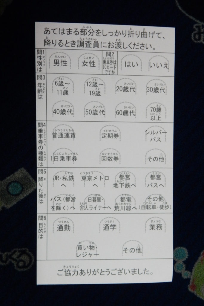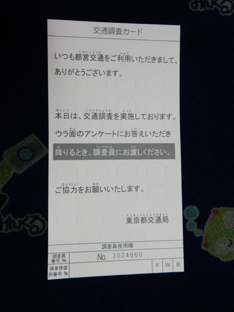 2015年10月に都営バスで実施された交通調査のカードです。乗車時に渡され、降車時に該当する箇所を折り曲げて係員に渡す形でした。バス車内でそのカードを記録してありましたので、公開します。