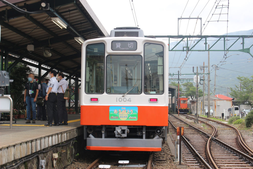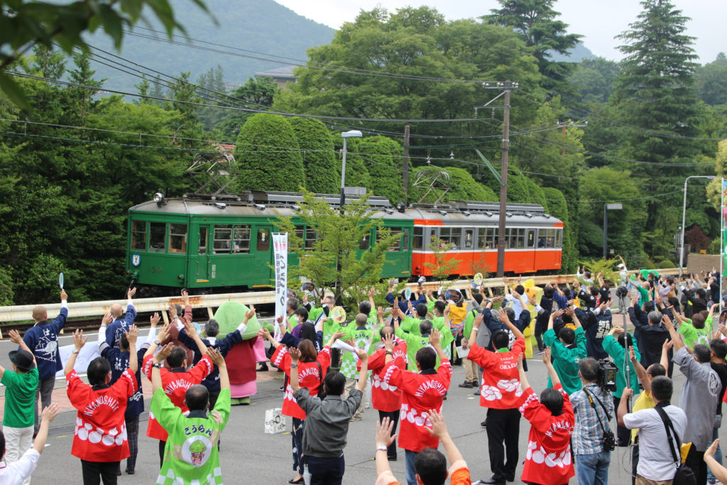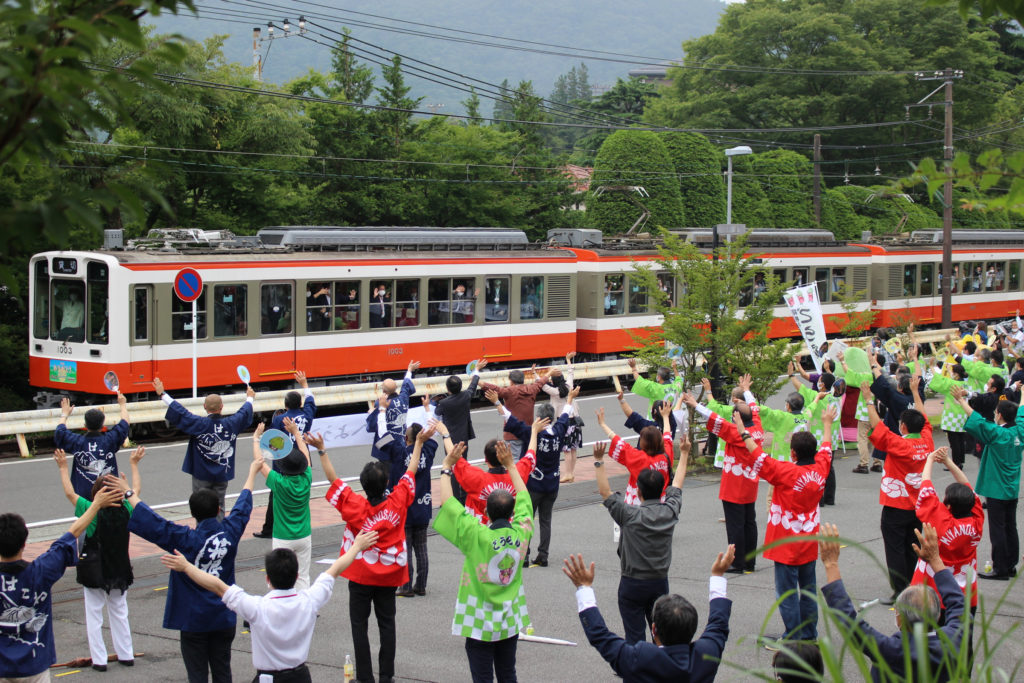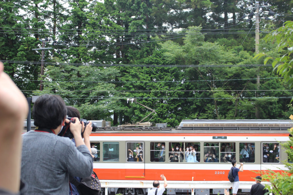 こちらは箱根湯本行きの定期列車。実はここでのお手振りが始まる前に、受付が置かれて人が集まり準備をしているのを少しだけ見ていたのですが、もうその高揚感といったらすごかったです。ベタな言葉ですけど、本当に登山電車は地元から愛されているなあと、そう感じました。