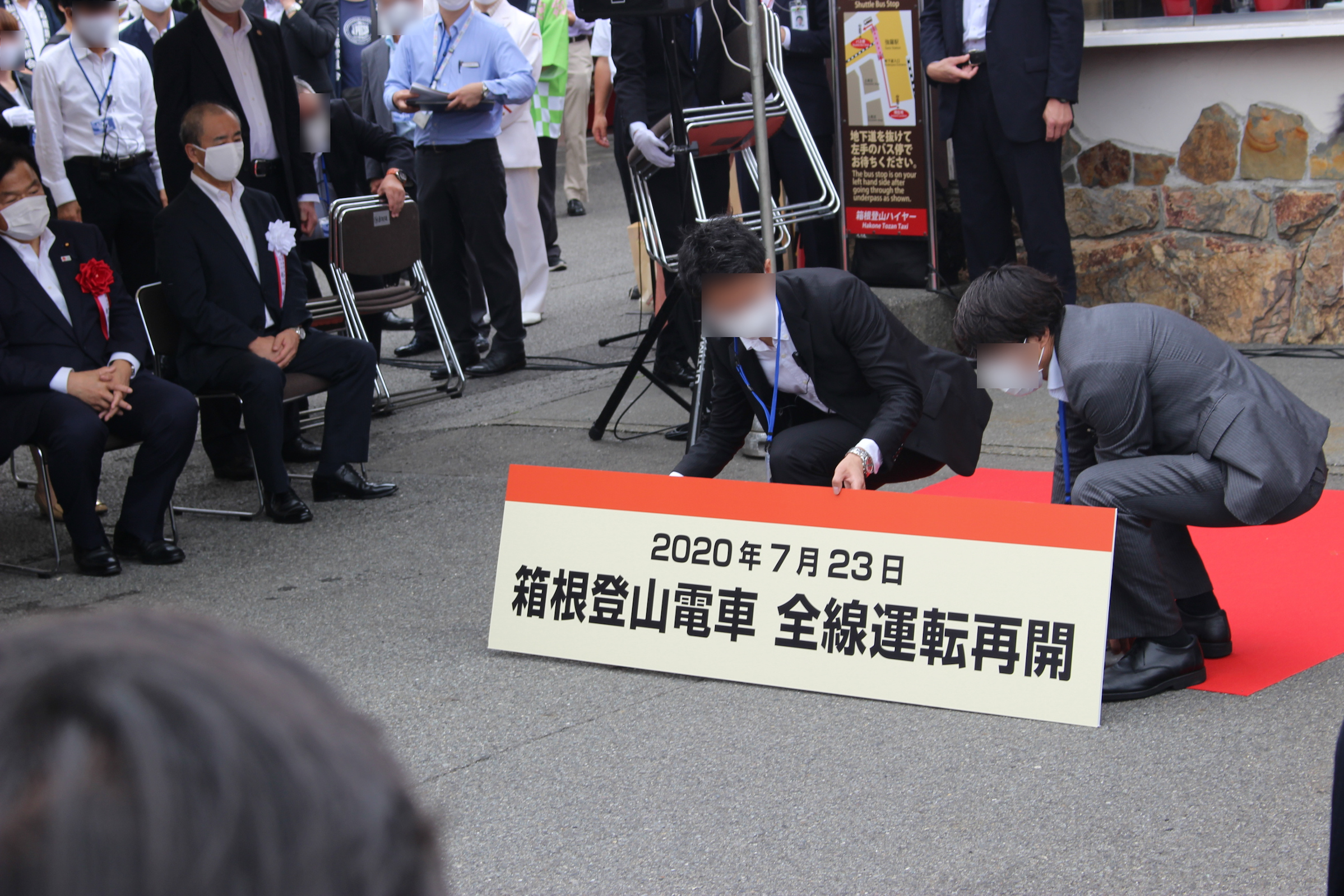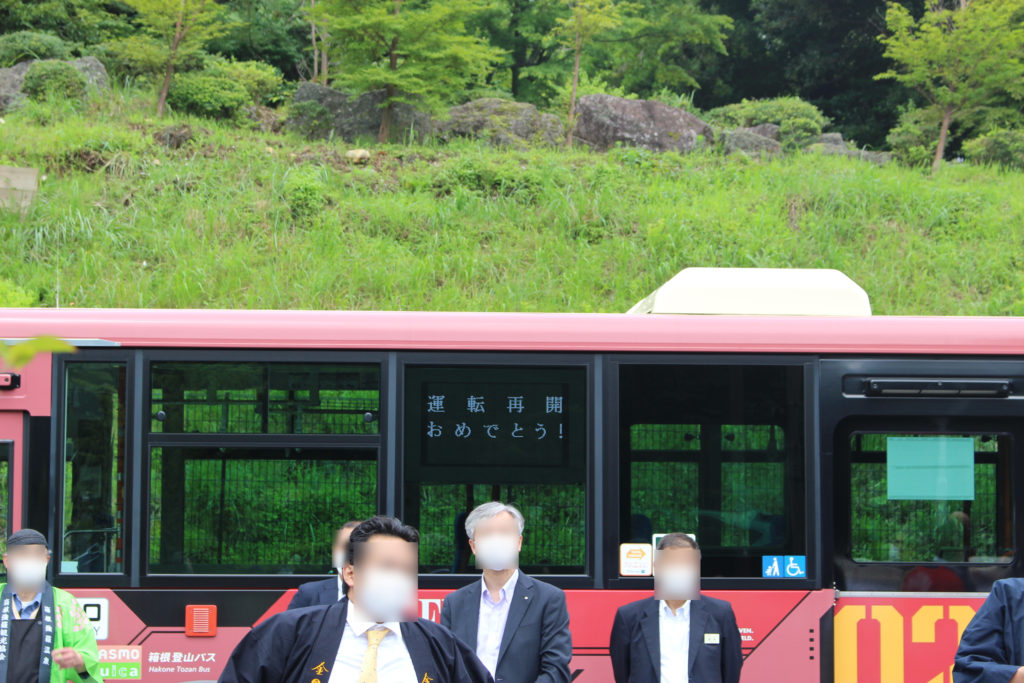 その後強羅駅前では運転再開記念の式典が行われ、抱山社長、赤羽大臣、黒岩知事、山口町長からお話がありました。特に抱山社長と山口町長の口から多く出たのは「感謝」。お二人とも、この方々、あの方々と細かく感謝の意を述べられ、胸が熱くなるとともに、改めてとてつもない多くの方々が登山電車の復旧や運休期間を支えてこられたんだなと感じることができました。また抱山社長の口からは、箱根登山鉄道と同様に昨年の台風19号で被災された方々や未だ復旧できていない輸送機関のみなさん、また先日来の豪雨で被災された方々や同業他社のみなさんへのお見舞いの言葉が述べられ、その言葉には当事者になったからこその重みを感じました。