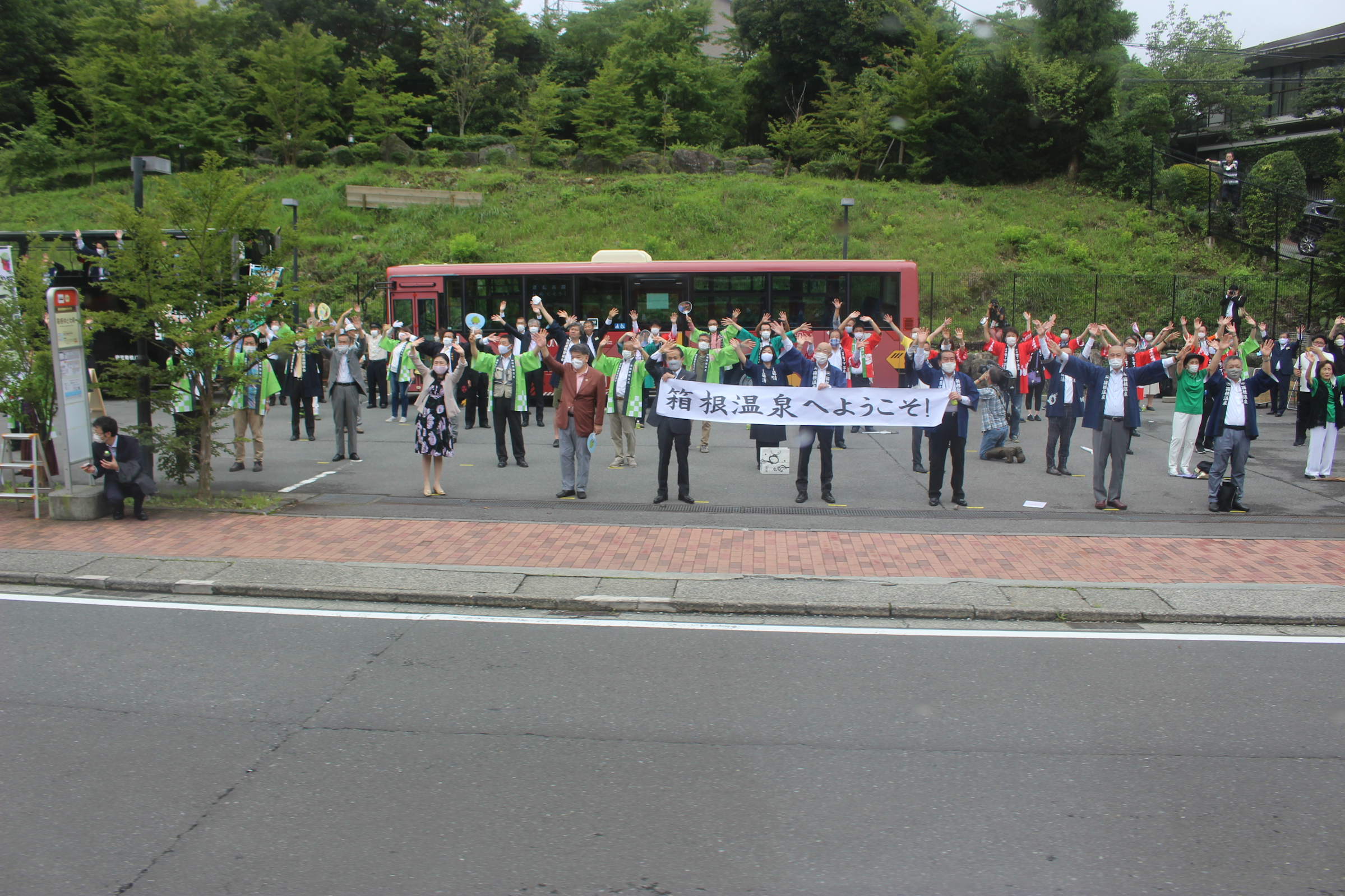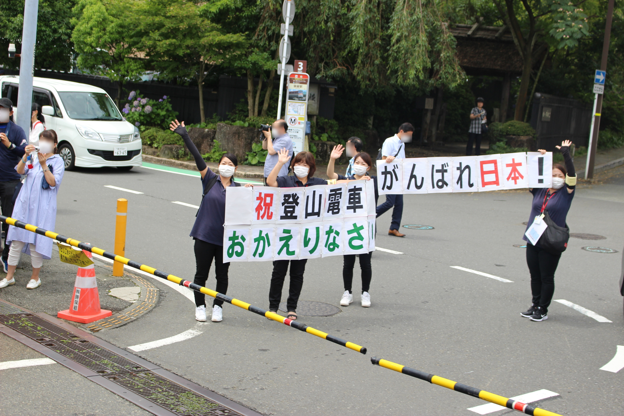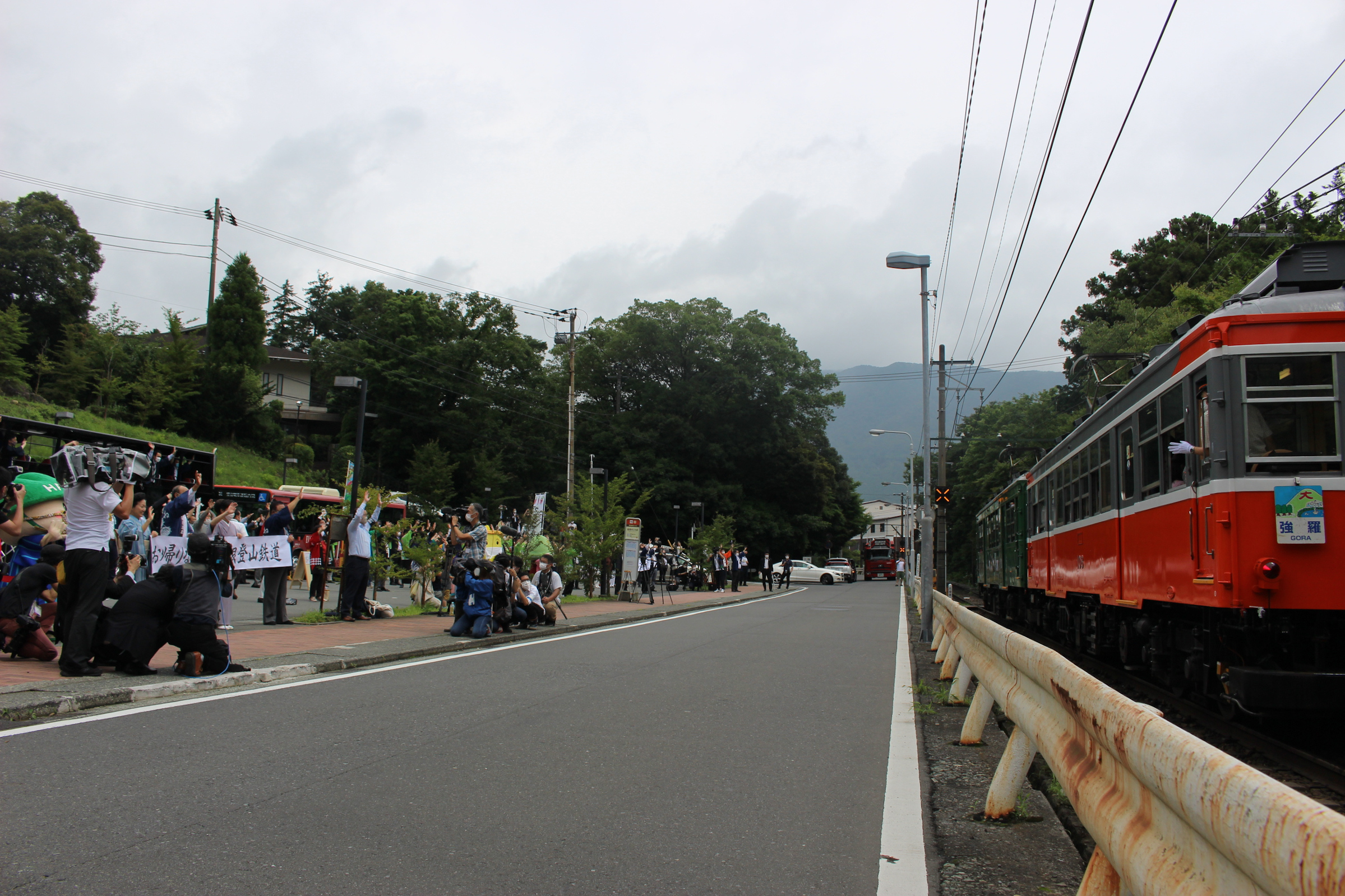 彫刻の森で電車を降りて、ゆとわ前にやってきました。強羅行きの定期列車です。車掌さんも手を振っています。横断幕を入れたかったのですが、報道陣の方の陰になってしまいました。しかも僕たちがいた位置、報道の方々からしたら画的に邪魔な位置だったかもしれません。申し訳ない。車道側で撮影しておりますが、路側帯からはみ出さないようにするなど、極力通行の妨げにならないよう注意して撮影しました。