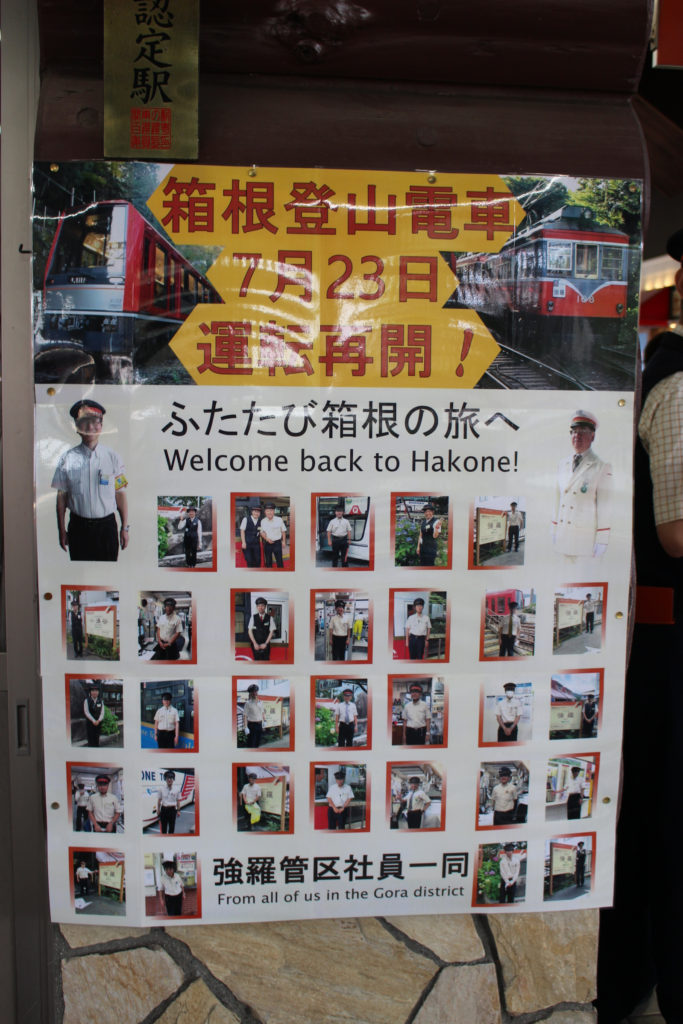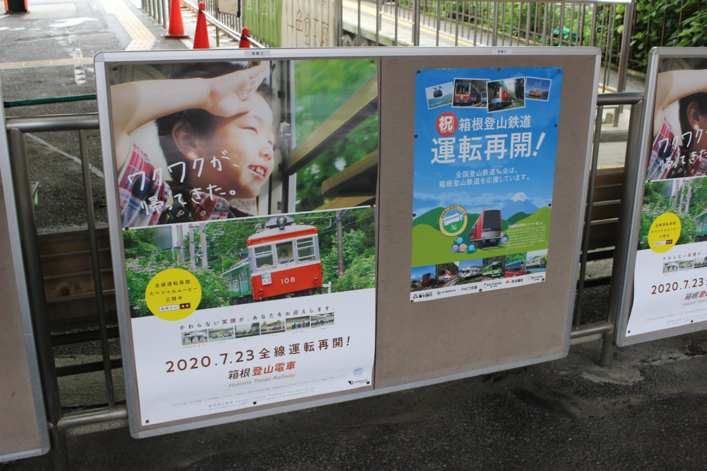 湯本から417列車で被災箇所を見ながら強羅へ(写真はありません)。車両はS3編成で、再開後の下り一番列車に使用された編成でした。さて、写真は運転再開記念のポスター類です。特に強羅管区では駅員さんたちが喜んでいるポスターが作られあちこちに貼られていました。喜びが伝わってきますね。パーミル会のお祝いポスターもありましたが、先日の豪雨で今度はパーミル会の一員である叡山電車が被害を受けてしまいました。叡電が一刻も早く運転再開できることを願います。