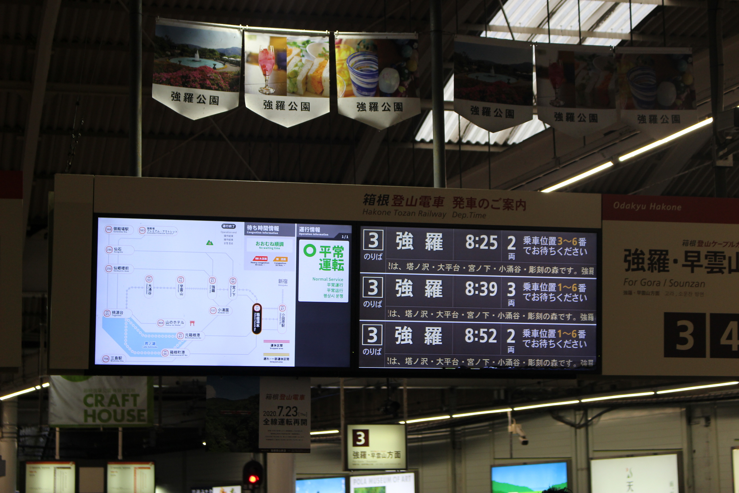 箱根湯本駅ホームの発車標です。長らく運休表示だったこの表示器。久々に全線が平常通りになりましたね。ただこの日は直後に機械故障のためロープウェイの早雲山-大涌谷間が運休になりましたが・・・。そしてやはり、発車標に「強羅」の文字が出ているのはとても感慨深いものがありました。ああ登山電車が動き出したんだなとそう感じた瞬間でした。