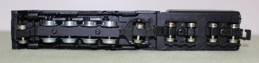 特徴的な足回りです。実車と同じく、先輪、動輪、従輪が再現されています。炭水車との連結部は固定されており曲がりません。